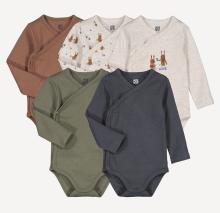 Détails produit • Lot de 5 • Motif imprimé lapins sur 1 body + 1 body uni avec lapins imprimé devant + 3 bodies unis • Naissance • Col V • Manches longues • Fermeture croisée et pressionnée devant pour faciliter l'enfilage • Entrejambe pressionné pour faciliter le change • CotonComposition et Entretien • 100% coton • Température de lavage 40° • Température de repassage faible / blanchiment interdit • &n
