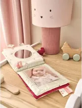 Ce jouet propose différentes activités: un miroir, du papier froissé, différentes étiquettes et textures, un anneau de dentition avec des perles qui produisent un son à chaque mouvement.