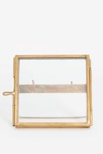 Goudkleurige staande fotolijst met dubbelglas. De fotolijst heeft een afmeting van 7.5 x 7.5 cm.