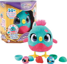 Peluche interactive Chick A Boo avec 2 bébés, qui danse, chante et pond des œufs. Plus de 50 sons et réactions pour amuser les enfants dès 3 ans.