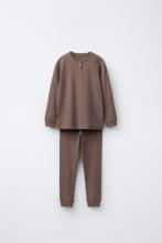 Pyjama deux pièces. T-shirt à col rond et manches longues avec poignets. Fermeture boutonnée sur l'empiècement avant. Pantalon avec taille élastique. Bas de pantalon avec poignets.