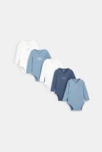 Indispensable dans le trousseau de naissance des petits, un lot de 5 bodies en jersey de coton doux. Manches longues. Fermeture croisée pressionnée idéale pour habiller facilement les nouveaux-nés.