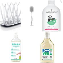 Egouttoir biberons + goupillon silicône + spray nettoyant + liquide vaisselle + lessive SANS PARFUM