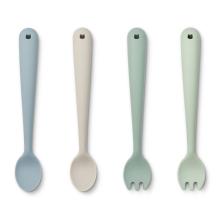 SOFT SILICONE FEEDING SET - 4 PACK The transitional step of learning to eat solid foods isn’t always easy. The Shea Feeding Set with baby cutlery is an easy everyday feeding set made from soft silicone, safe for your child and noiseless when dropped. Useful for those not so easy everyday meals - and a tad softer on eve
