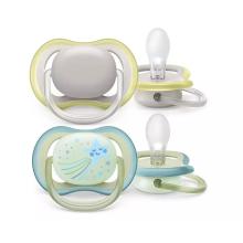 Une sucette avec le confort de l'air. La sucette Philips Avent Ultra Air est dotée de trous d'aération extra-larges pour garder la peau de votre bébé au sec. L'une des deux sucettes est dotée d'un bouton qui s'illumine dans l'obscurité, pour que vous puissiez le voir lorsque la lumière est éteinte.