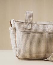 Sac à langer en coton seersucker à carreaux vichy. Il possède deux types d’anses (deux courtes pour l’accrocher à la poussette et une longue) et des compartiments à l’extérieur.Fermeture zippée.