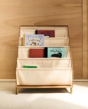 Bibliothèque enfant en métal avec quatre compartiments en tissu de coton, idéale pour organiser les livres et les jouets.