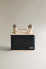 Il inclut deux micros sans fil d’une portée allant jusqu’à 10 mètres, un haut-parleur portable doté d’une anse et d’une batterie d’environ 4 heures d’autonomie, d’un câble de recharge, d’une fente pour carte micro SD et d’un port USB, ainsi que d’un câble AUX compatible avec d’autres instruments ou pour l’utiliser comme amplificateur.