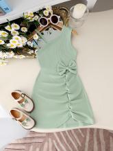 Robe casual légère de mode d'extérieur pour filles, robe élégante de longueur genou avec décorations de boutons aux épaules découvertes, en tricot jacquard de couleur unie, confortable et respirante pour l'été