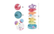 Een toren bestaande uit vele kleurrijke elementen met een grote basis om het geheel stevig in balans te houden. Met de ballen die over de spiraalbaan lopen