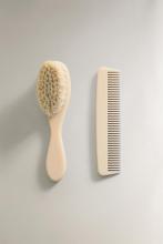 Ensemble bébé peigne et brosse en acétate avec détail de couleur contrastée, présentés dans une boîte.