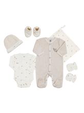 Le kit naissance 6 pièces en velours est parfait pour les premiers jours de bébé. Il comprend un pyjama et un body avec ouverture sur l'avant pour un habillage facile, un bonnet, des moufles, des chaussons, et un pochon assorti pour ranger les essentiels. La matière en velours doux garantit un confort optimal pour la peau délicate des nouveau-nés.Le coloris crème naturelle avec des touches terracotta est unisexe et moderne, adapté à tous les bébés.