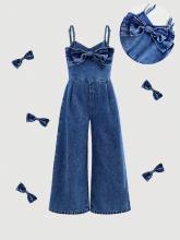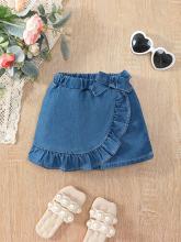 SHEIN Vintaside Kids Jeans en jean pour bébés filles avec jupe volantée, lavage bleu moyen, coupe ample, design nœud papillon à la taille, style mignon et décontracté, convient pour le port quotidien et extérieur