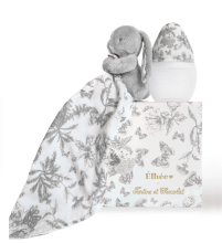 Coffret cadeau bébé : biberon 150 ml et doudou au motif Toile de Jouy gris signé Tartine et Chocolat, délicat et intemporel.
