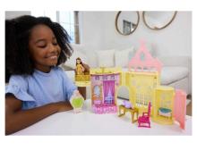 Petite poupée Jasmin, figurine Rajah le tigre, figurine Abu le singe, lit pour Rajah, pommes pour Abu, tapis volant rotatif et meubles (lit et coiffeuse) dans la chambre de Jasmine