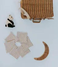 Composées d’un côté d’éponge écru super absorbante 100% coton, et de l’autre côté d’une double gaze à rayures caramel.