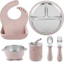PandaEar Set de Repas Bébé 6-en-1 en Acier Inoxydable | Assiette à Compartiments avec Ventouse, Bol, Gobelet avec Paille, Bavoir, Cuillère & Fourchette | Essentiels Sans BPA pour l’Alimentation Autono : Amazon.fr: Bébé et Puériculture