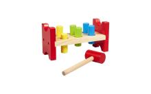 Votre petit frappe sur les 6 bâtonnets colorés de ce jeu d'adresse en bois avec le marteau, elles tombent et il n'y a plus qu'à retourner le banc à martele