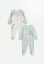 Lot de 2 pyjamas bébé en velours dina bleu - Deux grenouillères en velours tout doux, dans les tons bleu céladon et écru, avec de jolis petits nœuds sur les pieds pour une touche délicate.