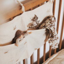 Ce rangement multi fonctions pour lit bébé est un accessoire déco élégant et très pratique. Il est en double gaze de coton et entièrement brodé d'hirondelles. Vous pourrez y déposer toutes les affaires de bébé comme ses livres, son pyjama ou encore son doudou favori... Les trois liens vous permettent de l'accrocher et