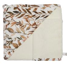 Il se compose d'une cape de bain et d'un gant de toilette en éponge dans un imprimé tendance et un coloris délicat.