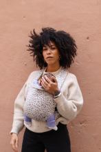 • Tissu 100 % coton tissage jacquard motif léopard sur fond écru. • Anneaux en aluminium coloris bronze. • Sangles en nylon. • Clips en polymère certifiés pour la sécurité.
