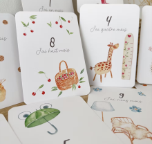 Astrid, qui a superbement illustré un cadre dans le chambre de Pépiño, propose un chouette format pour garder une trace : 12 cartes étapes illustrées à l'aquarelle et imprimées sur un papier fine art pour accompagner les 12 premiers mois d'un enfant. Les versos des cartes sont vierges pour permettre aux parents d'écrire chaque mois quelques souvenirs ou un petit mot à leur bébé.