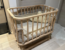 Berceau cododo en bois naturel, sur roulettes et qui se balance. Hauteur du matelas réglable.