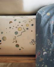 Drap-housse en coton 200 fils pour enfant orné de motifs sur le thème de l’espace et de détails brillant dans le noir. Ajustable grâce à des élastiques dans les angles. 60 x 120