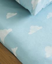 Drap-housse ajustable pour enfant confectionné en coton délavé et à imprimé nuages. Il possède des élastiques adaptables dans les coins. 60 x 120