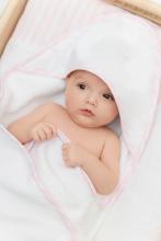 Cape de bain Garda rose pâle en popeline de coton et éponge. Livré dans un pochon en rayures Garda. Dimensions : 80 x 80 cm. La ligne Garda : une ligne emblématique qui symbolise tout l'esprit Tartine et Chocolat. Des rayures chics et élégantes, associées aux couleurs pastel de l'enfance, un écusson finement brodé, des tissus doux et tendres. Fabriqué au Portugal. Dimensions : 70x70cm