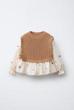 Chemise à col rond et manches longues aux poignets élastiqués. Détails de fleurs brodées couleur contraste. Gilet en maille superposé à col rond et sans manches. Application de lacets sur les côtés.