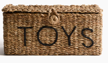Boîte de rangement rectangulaire en jonc de mer tressé pour les jouets et autres petits articles.