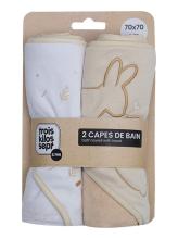 Ce lot de 2 capes de bain bébé est parfait pour envelopper et sécher bébé après le bain. Conçues pour les nouveau-nés, ces capes de 70x70 cm offrent une taille idéale pour un confort optimal. Chaque cape est équipée d'une capuche pratique pour garder la tête de bébé bien au chaud, évitant tout refroidissement. Le lot comprend une cape beige ornée d'une broderie délicate et une cape blanche avec de jolis motifs, alliant praticité et esthétique. Ces capes sont douces, faciles à entretenir et adaptées à un usage quotidien.