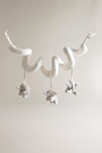 Spirale d'activités avec trois éléphants en peluche, chacun réalisant une action différente pour stimuler la curiosité de bébé. Ils sont similaires entre eux, mais avec des formes variées qui enrichissent l'expérience sensorielle. Elle s'adapte facilement à la plupart des poignées de porte-bébés et aux barres de chariots.
