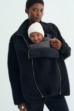 Veste en doux tissu Teddy bear, à utiliser aussi bien durant la grossesse que par la suite lorsque vous portez votre bébé. Coupe flottante avec col droit et fermeture à glissière devant. Poches latérales zippées. Insert de portage amovible et doublé de jersey avec élastique habillé en haut et à la base.