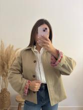 Veste Trench Couleur : beige avec motif fleurs à l'intérieur Coupe oversize Taille S, M ou L (choisissez votre taille habituelle, même si vous prévoyez de le porter avec un pull.) Se resserre à l'arrière avec boutons si besoin Le modèle mesure 1m60 et porte une taille M