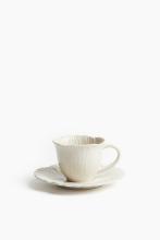 Tasse à expresso et soucoupe d'inspiration florale en grès cérame à la glaçure brillante. De quoi savourer votre café du matin avec élégance et originalité. Hauteur de la tasse 5,6 cm. Diamètre de la tasse 7 cm. Diamètre de la soucoupe 12,5 cm.