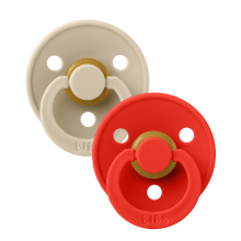 Soft and durable BIBS Colour pacifiers in Vanilla and Candy Apple. Designed with a natural rubber nipple and lightweight shield for gentle baby care.