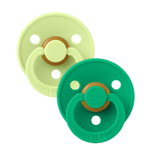 The BIBS Colour Pacifiers 2 Pack in Matcha/Cactus includes natural latex round and anatomical nipples, offering gentle soothing comfort in two modern, earthy tones.