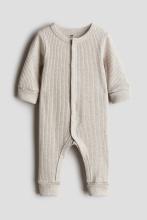 Combinaison côtelée en jersey de coton très doux. Modèle à manches longues avec fermeture pressionnée devant, se prolongeant le long des jambes. Manches et jambes terminées par bord repliable présentant une grande longueur afin de s’adapter à la croissance de l’enfant.