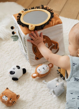 - 6 faces avec activités et découvertes (fente pour attraper les balles + miroir + hublot + éléments à toucher) + 6 balles sensorielles en velours en forme d'animaux + 2 rubans + une feuille à tirer + un hochet à billes suspendu.