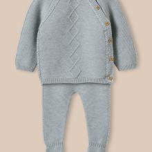Un ensemble chaud en laine majoritaire et coton biologique, travaillé sur une maille fantaisie et un jeu de torsades raffiné. Col polo. Ouverture par boutons en bois Jeu de torsades devant Taille élastiquée au legging