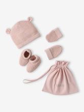 Un ensemble essentiel pour les premiers jours de bébé. Ce kit en maille toute douce est idéal pour la peau fragile de bébé. Il comprend : un bonnet, des gants et des chaussons pour