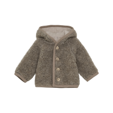 Veste en laine mérinos douce et chaude, entièrement doublée. Capuche pointue à pompon, boutons en bois et poches pratiques. Parfaite pour les sorties fraîches.