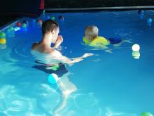 Une accoutumance à l'eau en douceur remplie de plouf, de rires accompagnés d'un partage relationnel entre parent et enfant.