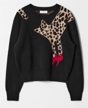 Een sweater van lichte joggingstof met een print. De sweater heeft een ronde hals met een drukknoopsluiting aan één kant (niet in maat 92-104) en verlaagde schoudernaden. De hals, de mouwen en de onderkant hebben een ribboord.