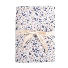 Un grand lange écru aux motifs fleuris bleus et caramel, pratique pour emmailloter bébé ou en couverture d'été. Oeko-tex. En coton bio. Fabrication Portugal.