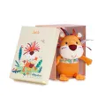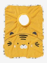 Un grand bavoir qui protège bien les vêtements durant les repas ! Décoré d'une petite bouille d'animal avec oreilles volantes et d'un joli biais imprimé, bébé va adorer l'enfiler !