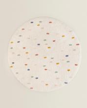 Children's cotton rug with multicoloured polka dots.The 140 x 140 cm (diameter) size is round.The 150 x 200 cm size is rectangular and finished with tassels on the corners.We recommend cleaning with a damp white tea towel and air drying.